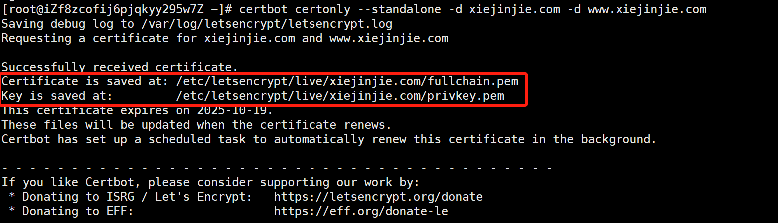certbot certonly --standalone -d example.com -d www.example.com命令执行成功后,会在服务器上生成SSL证书的凭证和密钥。