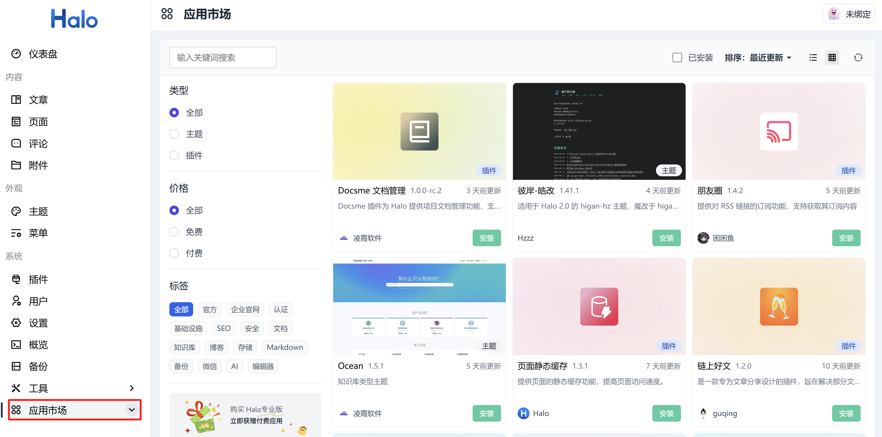 halo控制台中的应用市场有丰富的主题和插件,可以选择自己喜欢的主题或者插件直接安装使用。