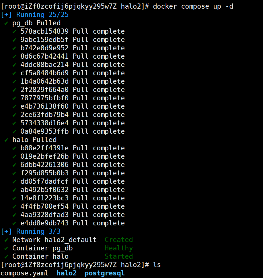 docker compose up -d命令执行成功后,halo2目录下会多出两个目录halo2和postgresql,这两个目录下是前面compose.yaml中定义的服务和数据库挂载目录,用来存放博客服务的数据文件。