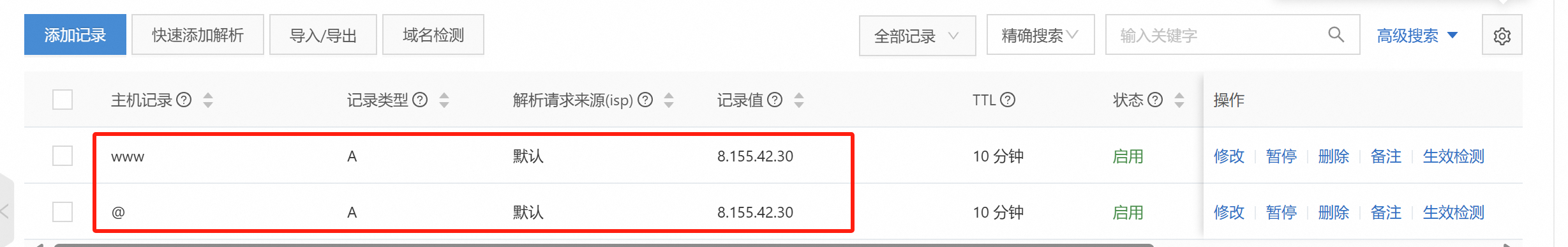 在云服务厂商的域名管理菜单,添加两条A解析记录 「@」 和「www」指向服务器ip。