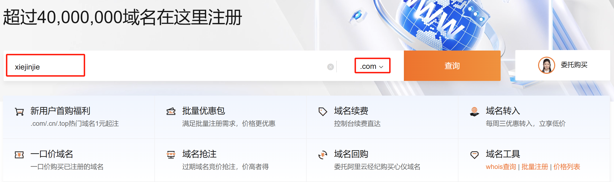 部署好的博客虽然可以通过「服务器ip+端口」直接访问,但是方便记忆。我们还需要购买一个域名,比如我选择的域名是xiejinjie.com 。