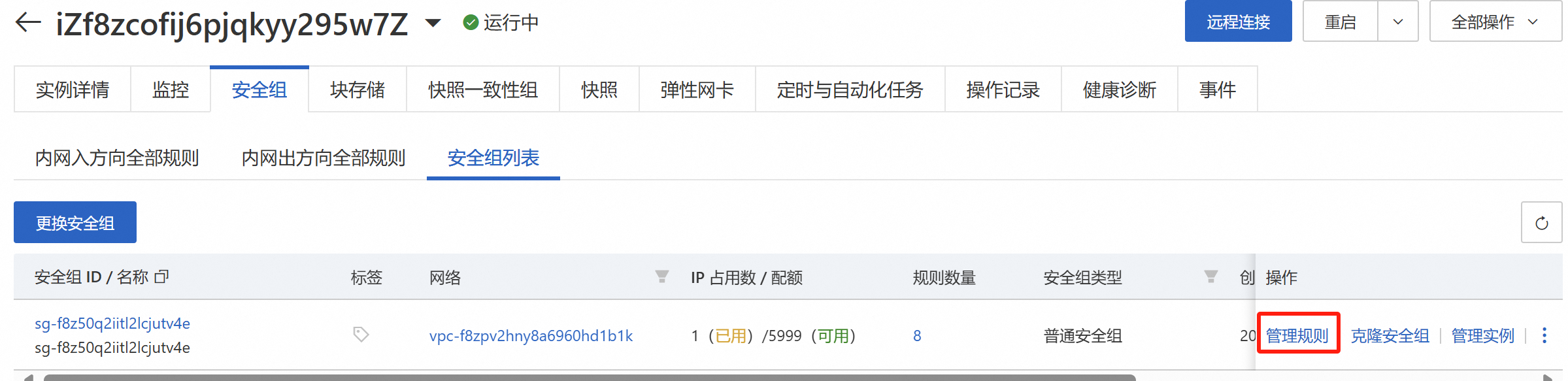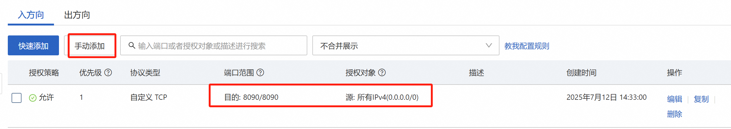 服务成功启动后,云服务厂商服务器的配置安全组规则页面,配置允许8090端口访问。