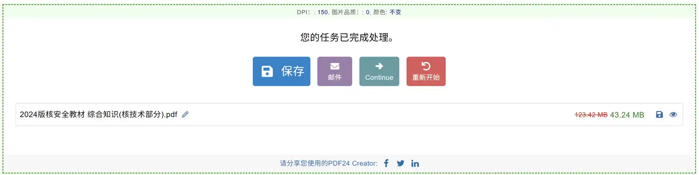 PDF24有在线版和Windows离线版,在线服务的网络质量不是很好,我用的时候压缩好的文件半天下载不下来。