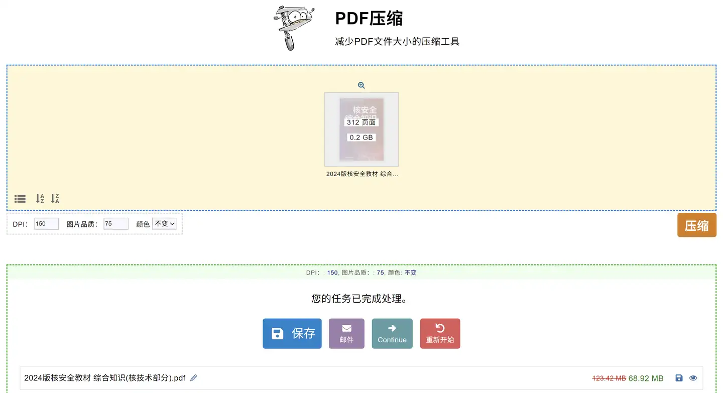 可以修改图片品质增加压缩率,我这里修改到 0,压缩后只有43M,压缩后PDF效果还可以。